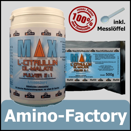 L-Citrullin ist eine nicht proteinogene α-Aminosäure, das heist diese wird von Pflanzen und Tieren produziert. L-Citrullin kommt vor allem in der Rinde der Wassermelonen vor. Durch die Einnahme dieser Aminosäure kann der körpererigene Argininspiegel stark erhöht werden.DL-Malate (Die Äpfelsäure und ihre Salze) sind hier als Lebensmittelzusatzstoff beigemischt, dadurch entsteht ein säuerlicher Geschmack.